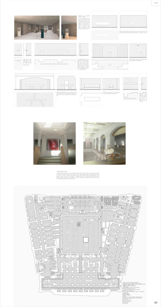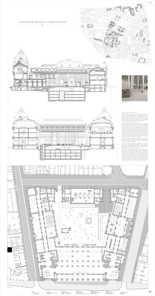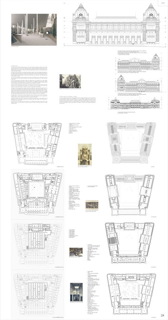 Există, de asemenea, o stratificare conceptuală majoră care include întregul Muzeu, atât componenta existentă, cât și cea nouă: subsolul Muzeului conține fundamentele istoriei națiunii: Preistorie, Antichitate, Tezaur, friza Columnei lui Traian, depozitul de patrimoniu, laboratorul de restaurare și de conservare, artefactele; parterul, prin curtea sa hipostilă dar, de asemenea, conectat cu orașul prin intermediul intrării publice, este mai deschis, mai plin de viață, fiind gazdă pentru expoziții temporare, cafenele și un restaurant, pentru istoria orașului, pentru expoziția Centrului Istoric din București și pentru Muzeul Românilor de Pretutindeni; etajele superioare sunt dedicate secțiunii istorice din Evul Mediu și până în prezent; partea de sus (etajul al doilea și mansarda) evidenţiază auditoriul și biblioteca în poziție centrală de referință, subliniind astfel structura principalelor cupole și aripa de pe Calea Victoriei.