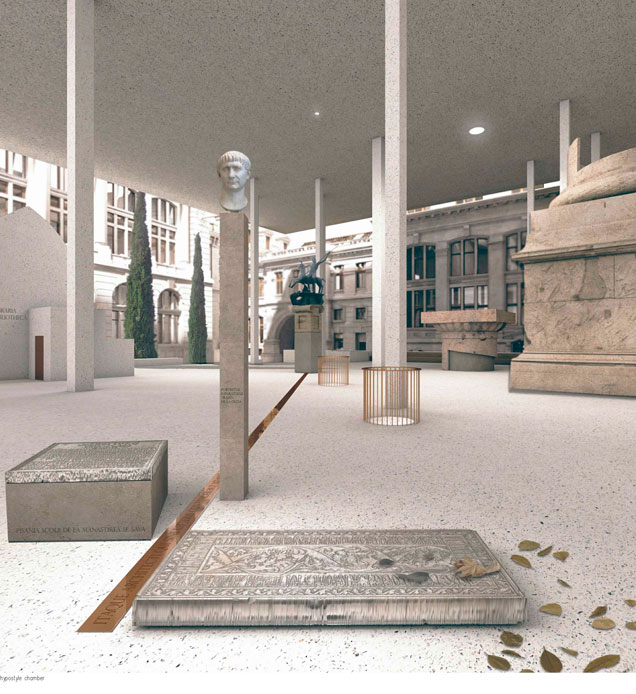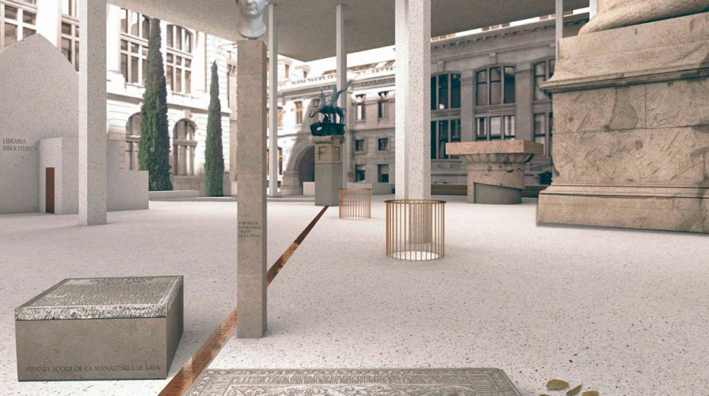 Acoperirea, dorită a fi o placă solidă și imponderabilă în același timp, este susţinută de coloane ce par mai degrabă întinse decât comprimate (cu rol de susținere) – acestea sunt distribuite aleatoriu şi uniform, între ele definindu-se locuri pentru referinţele istorice: baza Columnei Romane, percepută de la nivelul ochiului la fel ca în cazul originalului, dar fără solemnitatea caracteristică, apoi principala piesă a expoziției, statuia Sf. George, piatra funerară, sculptura cu capul lui Traian, statuia cetățeanului roman, Altarul lui Osiris și Casa Cărții. Macheta vechiului București străjuieşte intrarea în expoziția amplasată în Centrul Vechi. Acoperișul «suspendat» lasă fațadele interioare ale vechii clădiri vizibile și expuse, permițând luminii să pătrundă și să vibreze relieful şi decoraţiunile acestora.